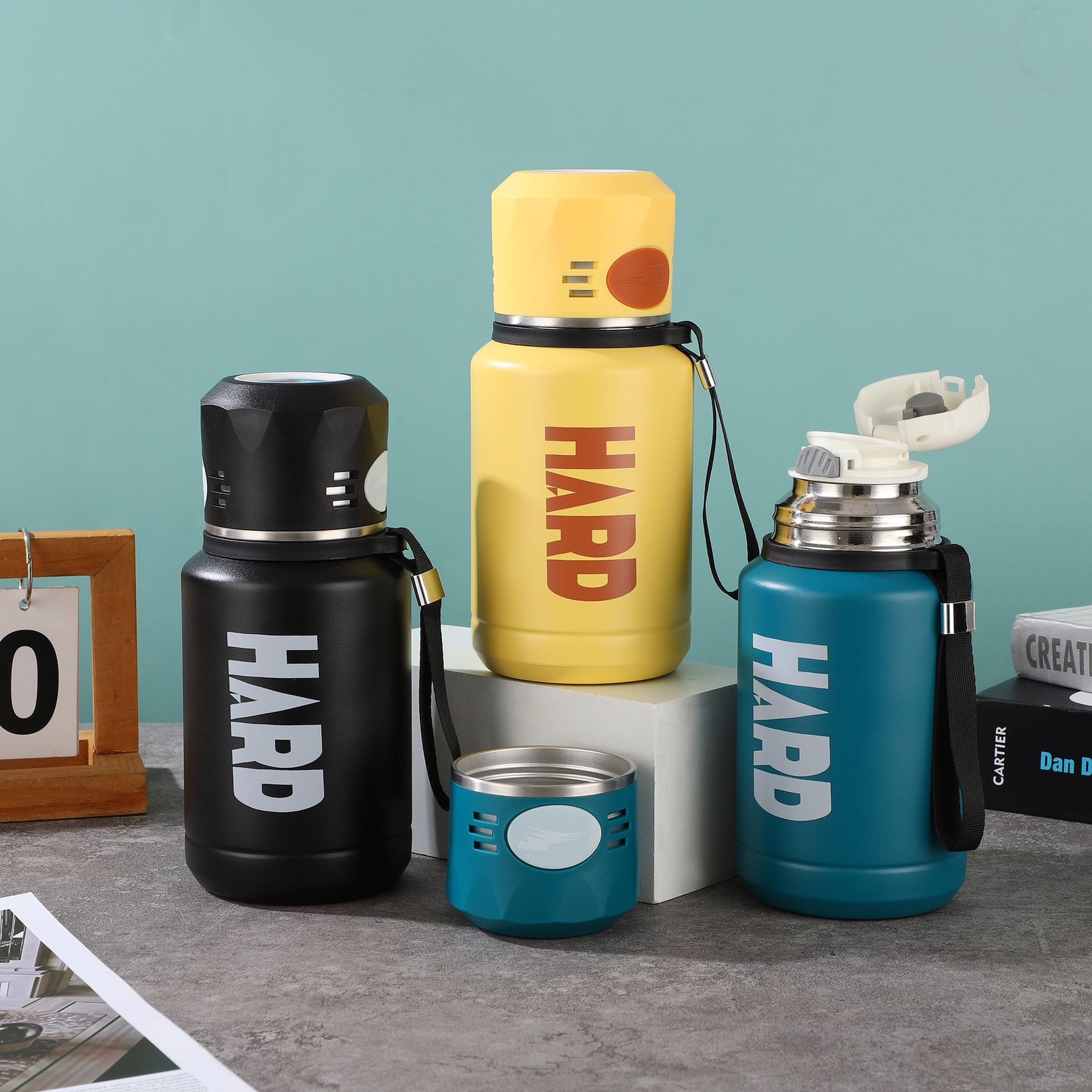 This HARD thermos bottle features a bold design with the "HARD" lettering and a black lanyard for easy carrying. It is built to maintain the temperature of your drinks. Moreover, it comes in multiple styles for you to choose from, allowing you to select the one that matches your personality.
